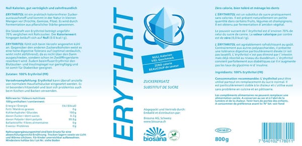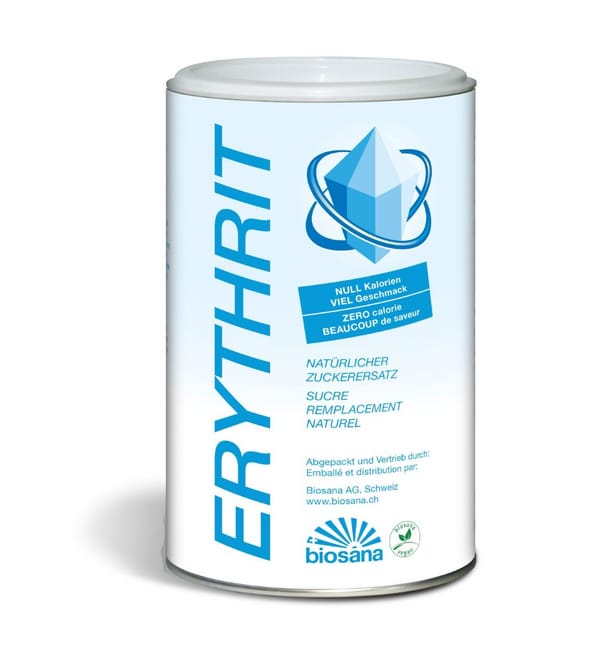 Der natürliche, zahnfreundliche Light-Zucker. Erythritol ist ein neuer, natürlicher und praktisch kalorienfreier Zuckeraustauschstoff, der in vielen Arten von Gemüse und Früchten vorkommt. Gegenüber den anderen Zuckeralkoholen weist es eine besonders hohe, digestive Toleranz auf (ca. 1 g/kg Körpergewicht). Da Erythritol schon zu 90 % über den Dünndarm aufgenommen wird, sind die sonst für Zuckeralkohole üblichen Nebenwirkungen wie Blähungen und Durchfall stark vermindert. Es wird also nicht über den Darm ausgeschieden, sondern schon im Zwölffingerdarm resorbiert, ist somit optimal verdaulich und wirkt nicht abführend. Erythritol bewirkt, dass nach dem Essen der Blutzuckerspiegel weniger stark ansteigt als bei der Einnahme von zuckerhaltigen Lebensmitteln oder Getränken. Die Süsskraft von Erythritol beträgt ungefähr 70% verglichen mit Rohrzucker. Der Kalorienwert hingegen beläuft sich auf Null (0,0 kcal/g).