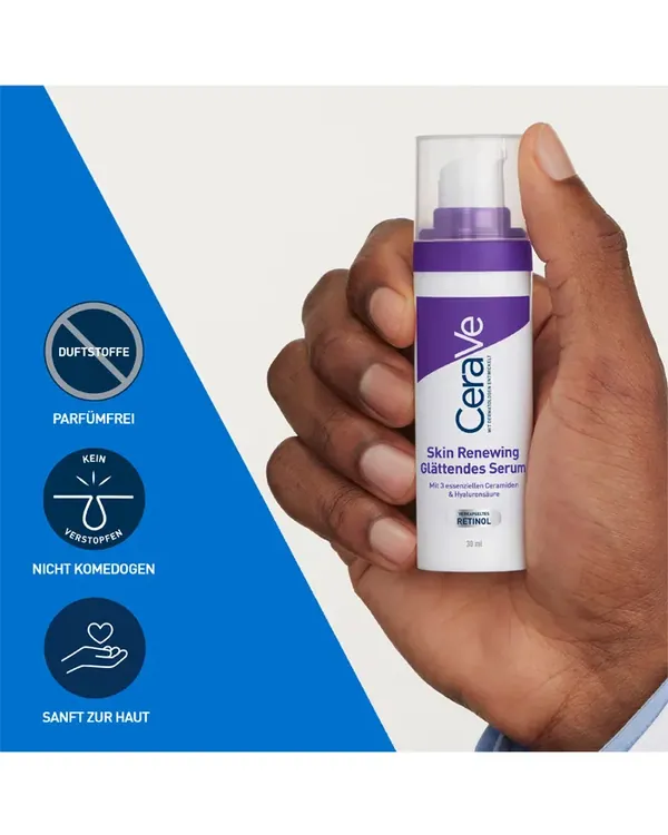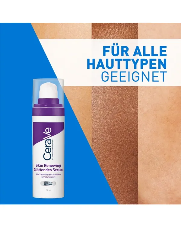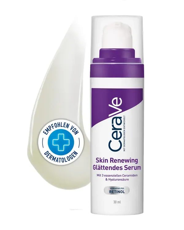 Das CeraVe Skin Renewing Glättende Serum glättet die Haut und lässt sie ebenmässiger erscheinen. Dank Retinol werden feine Linien, Falten und Hautunebenheiten gemildert, während Ceramide die Hautbarriere stärken und wiederherstellen. Das nicht komedogene und parfümfreie Anti-Aging-Serum hat eine cremig-leichte Textur, die weder klebt noch Rückstände hinterlässt.