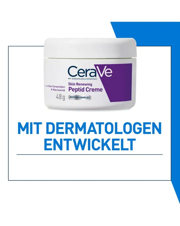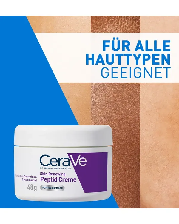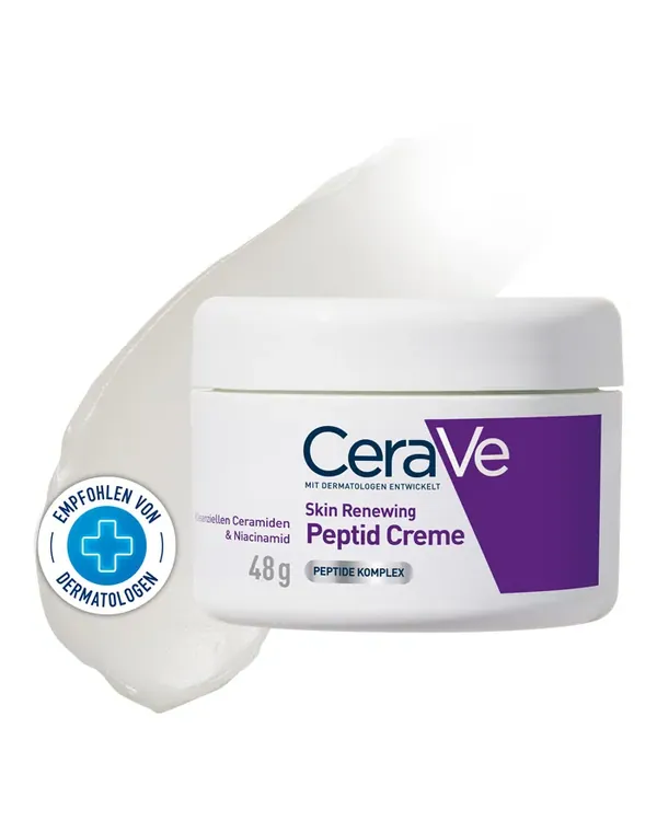 Die CeraVe Skin Renewing Peptid Creme spendet der Haut intensive Feuchtigkeit und verleiht ihr gleichzeitig mehr Spannkraft. Wegen ihrer leichten Textur zieht die reichhaltige Anti-Aging-Creme schnell ein und verbessert dank Peptid-Komplex über Nacht das Aussehen von müder, fahler Haut. Durch ihre nicht komedogene Formel ohne Duftstoffe ist die Nachtcreme für alle Hauttypen geeignet.