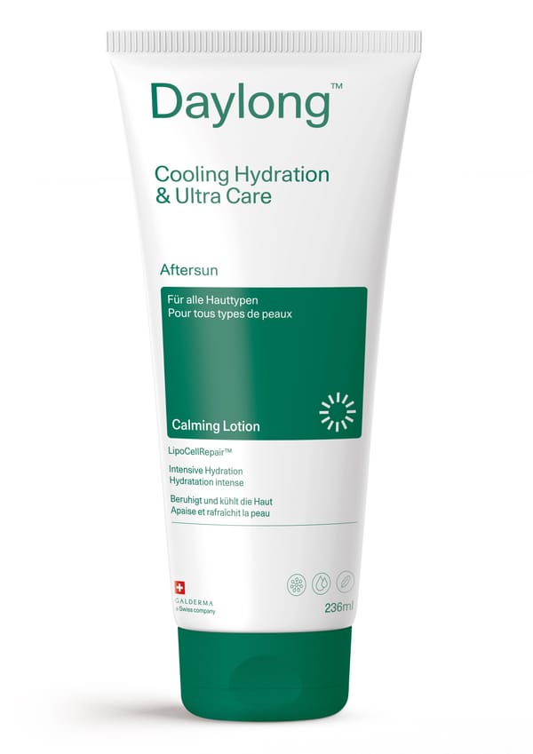 Für die Regeneration jedes Hauttyps nach dem Sonnenbad mit Wohlfühleffekt: Die Daylong™ Cooling Hydration & Ultra Care Calming Lotion. Die kühlende Lotion ist dermatologisch getestet und ihre Effizienz ist klinisch belegt. Sie versorgt die Haut mit intensiver Feuchtigkeit, zieht schnell ein und unterstützt dank ihres hohen Lipidgehaltes die Rückfettung, für ein angenehmes Hautgefühl. Daylong™ Calming Lotion macht aber noch viel mehr für deine Haut: Dank LipoCell Repair™ werden die Inhaltstoffen mittels Liposomen enkapsuliert, sodass die Lotion gleichmässig in die oberste Hautschicht einzieht. Dies sorgt für eine bessere Haftung und Stabilität der Inhaltsstoffen.