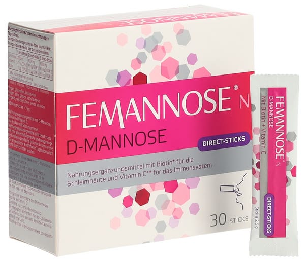 Femanosse N Direct-Sticks enthalten den natürlichen Inhaltsstoff D-Mannose und sind das ideale Produkt für unterwegs, auf Reisen oder im beruflichen Alltag.