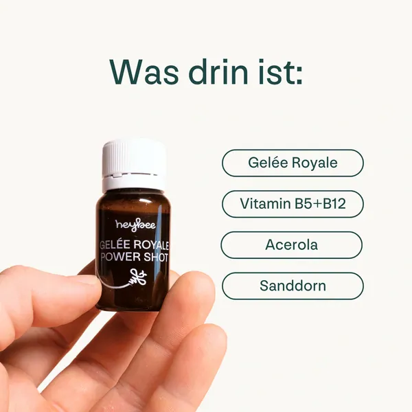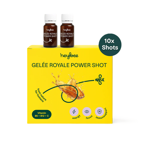 Gelée Royale, das Geheimnis der Bienenkönigin, liefert zahlreiche bioaktive Nährstoffe und ist bekannt für seine vitalisierende Wirkung. Ergänzt durch Vitamine (B5 und B12) sowie Pflanzenextrakte, unterstützt der Shot den Energiestoffwechsel, reduziert Müdigkeit und fördert die Konzentration – auch in stressigen Phasen.
