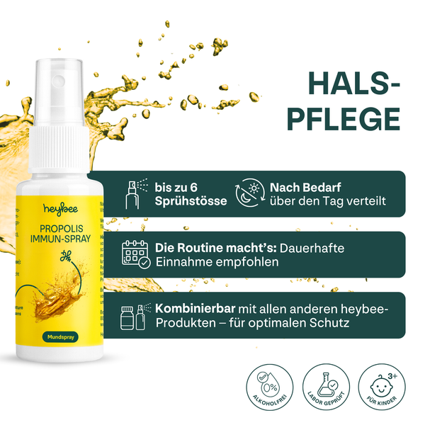 Die empfohlene Tagesdosis von 6 Sprühstössen darf nicht überschritten werden. Nahrungsergänzungsmittel sind kein Ersatz für eine abwechslungsreiche Ernährung. Die Produkte ausserhalb der Reichweite von Kindern lagern. Nicht geeignet für Personen, die gegen Propolis allergisch sind. Bei Raumtemparatur, vor Licht geschützt und trocken lagern.