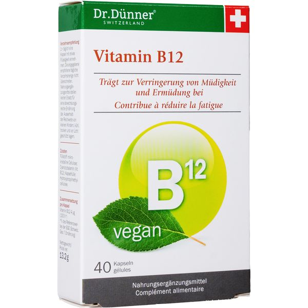1 Kapsel enthält: 4 Mikrogramm Cyanocobalamin (Vitamin B12) und entspricht der täglichen Zufuhr für Erwachsene gemäss der schweizerischen Gesellschaft für Ernährung (SGE).