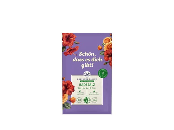 Der wunderbare florale Duft des Badesalzes „Schön, dass es dich gibt!" öffnet das Herz und verwöhnt die Sinne. Gönn dir einen besonderen Moment der Ruhe und Entspannung, der Körper und Geist harmonisch umhüllt. Mit wertvollen Bio-Hibiskus-, Bio-Aloe Vera- und Bio-Rosmarinextrakt pflegt es deine Haut sanft und sorgt für eine unvergleichliche Wohlfühlatmosphäre.