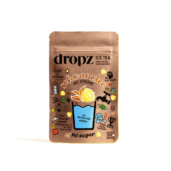 Mit dropz Schwarztee Zitrone zauberst du dir in Sekundenschnelle deinen eigenen Ice Tea. Kein Zucker, kein Aufwand – einfach dropz ins kalte Wasser, umrühren, fertig.