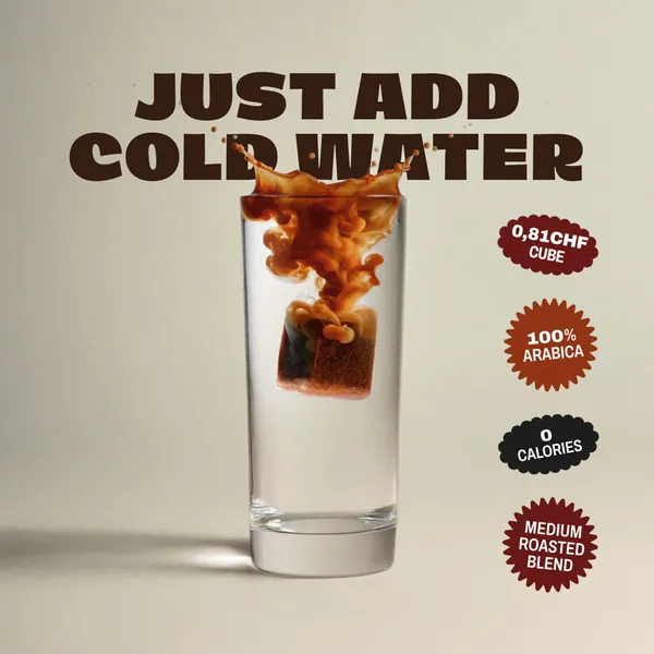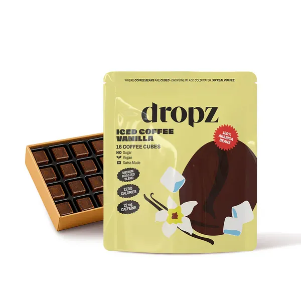 Iced Coffee Cubes sind Würfel aus echtem gebrühten Kaffee, Schock gefroren, um Aroma und Koffein zu bewahren. Einen dropz Cube ins Glas geben, kaltes Wasser darauf giessen, trinken, geniessen. Wie du es magst: pur, mit Hafermilch oder auf Eis.