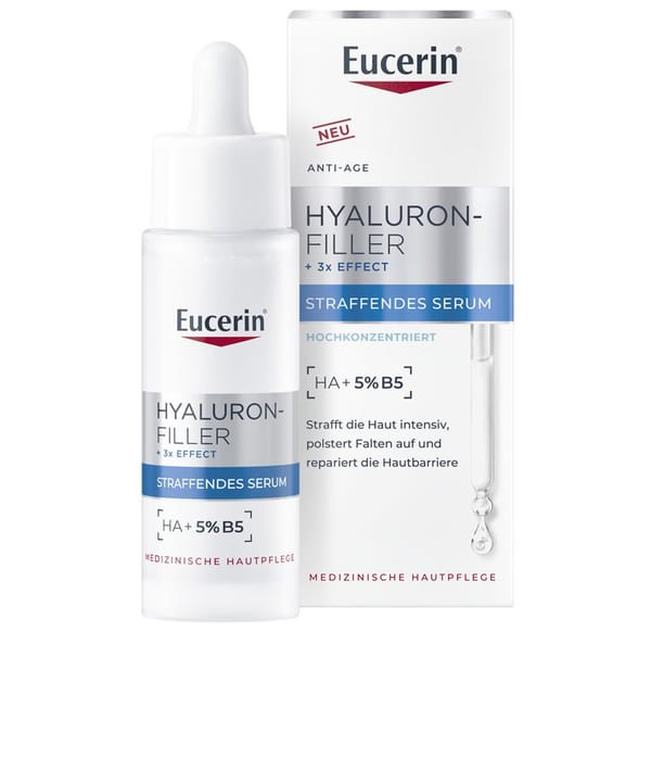 Mit zunehmendem Alter verliert die Haut an Spannkraft, Feuchtigkeit und Widerstandsfähigkeit. Es bilden sich Falten und die Haut sieht älter aus. Das hochwirksame Hyaluron-Filler + 3x Effect Straffende Serum von Eucerin kombiniert Hyaluronsäure mit 5% Provitamin B5, um die Haut sichtbar zu straffen, langanhaltend mit Feuchtigkeit zu versorgen, Falten aufzupolstern und die Hautbarriere zu stärken.