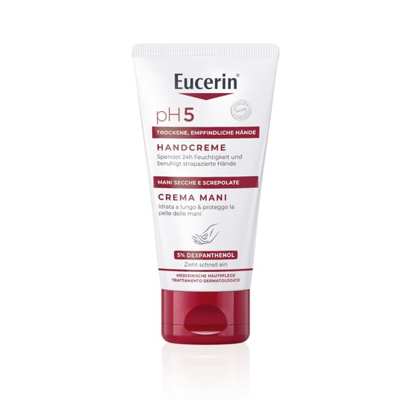 Die Eucerin® pH5 creme für trockene und empfindliche Hände ist mit 5% Dexpanthenol angereichert. Die Formel beruhigt die Haut und spendet ihr auf natürliche Weise Feuchtigkeit, was für sofortigen Komfort sorgt. Die Hände fühlen sich auch nach häufigem Händewaschen glatt und geschützt an.
