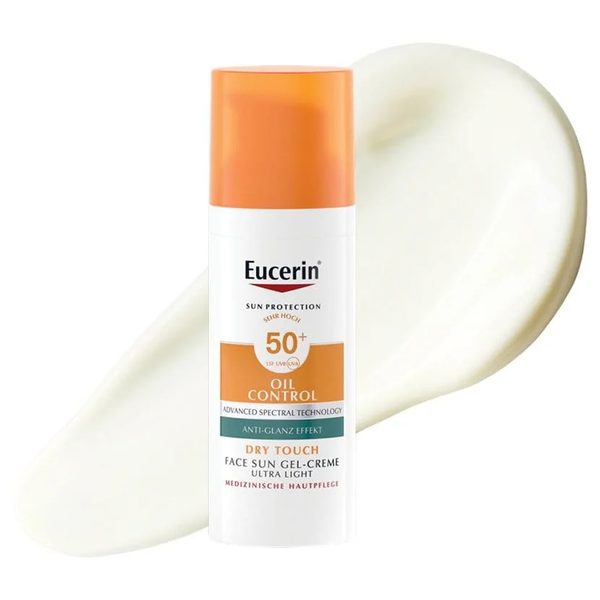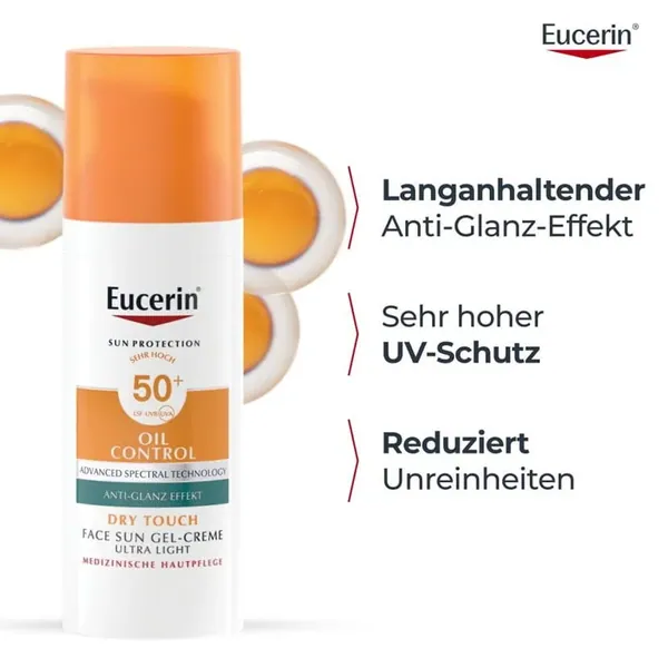 Eucerin Sun Gel-Creme Oil Control LSF 50+ ist ein ultraleichter Sonnenschutzgel für den täglichen Gebrauch mit sehr hohem Lichtschutzfaktor, die speziell für fettige und zu Unreinheiten neigende Gesichtshaut entwickelt wurde. Sie verbindet einen hervorragenden Lichtschutz gegen durch Sonneneinwirkung hervorgerufene Schädigungen der Haut mit einer aktiven Lösung zur Verbesserung des fettigen Hautzustandes.