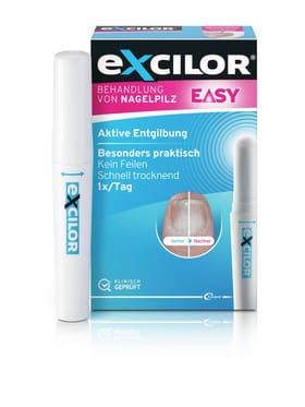 Nagelpilz kann sehr hartnäckig sein, weil Fussnägel nur langsam wachsen. Die Behandlung erfordert daher meist ein wenig Geduld. Doch viele empfinden gelb oder braun verfärbte oder verdickte Fussnägel als kosmetisch störend – vor allem im Sommer, wenn „Barfusszeit“ ist.  Excilor Forte wirkt extra stark gegen fortgeschrittenen Nagelpilz. Es gibt dem Nagel Gesundheit und Schönheit zurück – sichtbare Verbesserung schon vom 1. Tag an und kompatibel mit Nagellack!