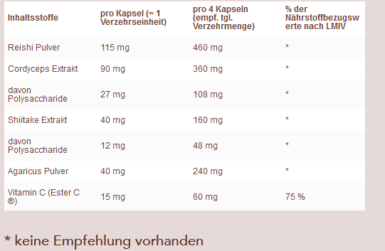 Reishi Pulver (29,1 %), Überzugsmittel: Hydroxypropylmethylcellulose (Kapselhülle pflanzlich) (24,1 %), Cordyceps Extrakt (22,8 %), Shiitake Extrakt (10,1 %), Agaricus Pulver (10,1 %), Calciumascorbat mit 0,9 % Threonat (Ester C ® = Vitamin C)