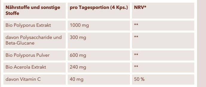 Die wohl interessanteste Eigenschaft vom Vitalpilz Polyporus ist die ungewöhnliche Vielfalt seiner Inhaltsstoffe, darunter eine hohe Konzentration an Kalzium, Eisen und Kalium sowie verschiedene B-Vitamine und die Vitamin-D-Vorstufe Ergosterol. Er enthält auch große Mengen der Spurenelemente Kupfer, Mangan und Zink sowie verschiedene spezifische Polypeptide und Polysaccharide. Die Kombination von Bio Polyporus Extrakt und Pulver in Kapselform vereint das Optimum beider Darreichungsformen.