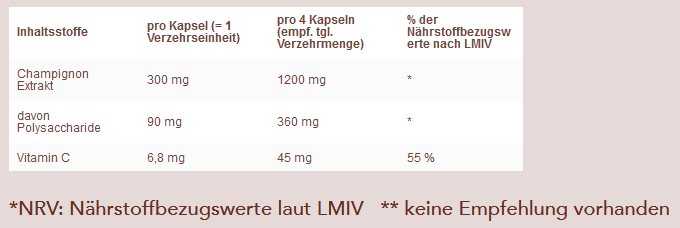 Polysaccharid- und betaglucanreicher Bio Champignon-Fruchtkörper Extrakt (Agaricus bisporus), Kapselhülle: Hydroxypropylmethylcellulose (Kapselhülle pflanzlich), Vitamin C haltiger Bio Acerola Extrakt