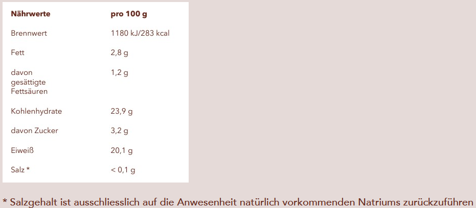 Von Natur aus gluten- und laktosefrei, 100 % vegan, ohne künstliche Farb- und Aromastoffe und ohne Gentechnik hergestellt.