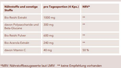 Polysaccharid- und beta-glucanreicher Bio Reishi-Fruchtkörper Extrakt (Ganoderma lucidum), Bio Reishi-Fruchtkörper Pulver (Ganoderma lucidum), Überzugsmittel: Hydroxypropylmethylcellulose (Kapselhülle pflanzlich), Vitamin C-haltiger Bio Acerola Extrakt.
