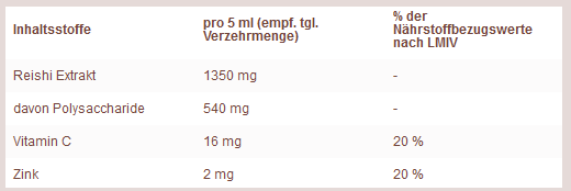 Der Reishi enthält seltene Spurenelemente wie Magnesium, Kalzium, Mangan, Zink Kupfer, Eisen und Germanium. Besonders wertvoll sind die bislang über 400 identifizierten, bioaktiven Inhaltsstoffen Triterpenoide, Polysaccharide, Phenole, Steroide, Proteine, Fettsäuren sowie andere bedeutende Mineralstoffe.