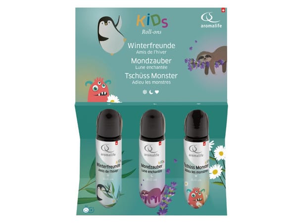 Kids Roll-on Winterfreunde: Mit hochwertigen Pflegeölen wie Hanf-, Traubenkern- und Nachtkerzenöl, sowie 100 % naturreinen ätherischen Ölen aus Zitrone, Eukalyptus radiata, Lavandin und Fichtennadel. Kids Roll-on Mondzauber : Mit hochwertigen Pflegeölen wie Hanf-, Traubenkernund Nachtkerzenöl, sowie 100 % naturreinen ätherischen Ölen aus Orange süss, Mandarine rot, Lavendel fein und Vanille. Kids Roll-on Tschüss Monster: Mit hochwertigen Pflegeölen wie Hanf-, Traubenkern und Nachtkerzenöl, sowie 100 % naturreinen ätherischen Ölen aus Orange süss, Lavendel fein, Wacholder und Kamille römisch.