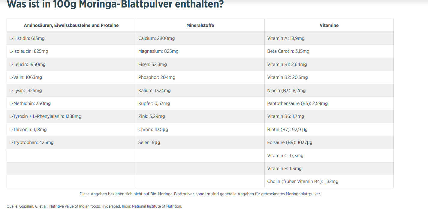Der tropische Moringabaum wird auch Wunderbaum genannt, weil man fast alles daran verwerten kann (Wurzeln, Rinde, Blätter, Blüten und Früchte). Moringa Vida enthält getrocknetes Blattpulver. Moringablätter enthalten eine Vielzahl an Mikronährstoffen, darunter fast alle Vitamine, Mineralstoffe und viele Spurenelemente.