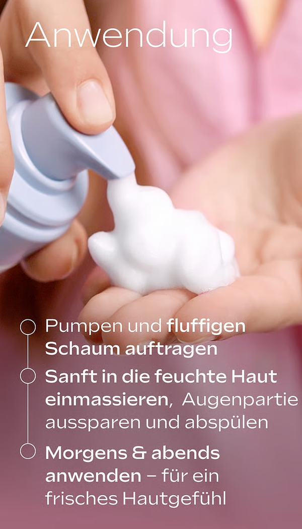 Pumpe eine Schaumwolke in deine Hand, massiere den Schaum so in dein Gesicht, dass er nicht in die Augen gelangt und spüle ihn dann mit warmem Wasser ab. Am besten morgens und abends verwenden.
