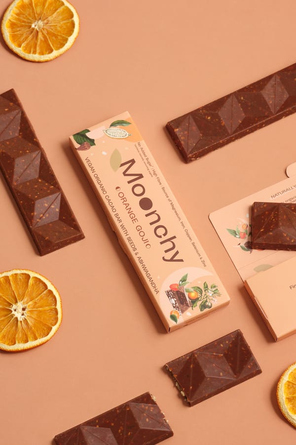 Moonchy Orange Goji ist ein fruchtig-milchiger Kakaoriegel mit Orangennoten, vollgepackt mit knackigen Samen und Gojibeeren. Pflanzlich aufbereitet mit Chiasamen, Sesamsamen, Sonnenblumenkernen, Kakaobohnen aus einer einzigen Anbauregion, Gojibeeren, Orangen und Ashwagandha.