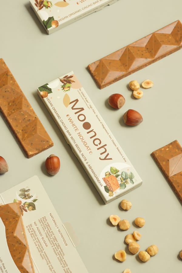 Moonchy White Nougat ist ein cremiger, weisser Kakaoriegel mit knackigen Samen und Haselnussstückchen, der intensiv nach Karamell schmeckt. Er enthält Chiasamen, Sesamsamen, Sonnenblumenkerne, Haselnüsse, Haselnusspaste und Ashwagandha.