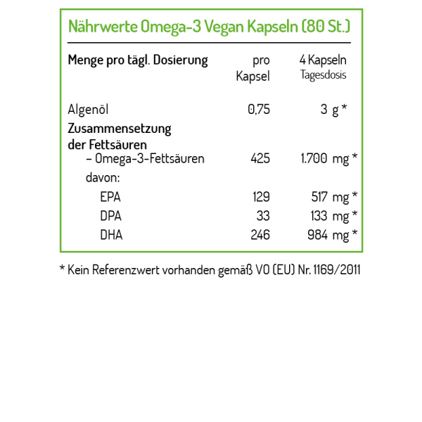 Mit nur einer Tagesdosierung von 4 Kapseln nehmen Sie 1.700 mg marine Omega-3-Fettsäuren auf. Somit sind die veganen Omega-3 Kapseln ein optimaler mariner Omega-3 Lieferant für alle, die sich frei von tierischen Lebensmitteln ernähren möchten.