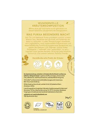 Deine innere Wandlung. Inspiriert von einem Rezept, das seit Generationen Behaglichkeit und Wohlgefühl spendet. Komm herein und mach es dir gemütlich, bei sonnengereifter Zitrone, schonend-getrockneter Ingwerwurzel und zarter FairWild™-Holunderblüte. Bist du aufgetaut? Dann wirst du gleich den samtigen Manuka-Honig-Kuss spüren.