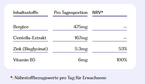 Bergtee (Sideritis scardica L.), Gotu Kola (Centella asiatica (L.) Urb., Hydrocotyle asiatica L.), Akazienfaser (Acacia seyal Delile), pflanzliche Kapsel (hydroxypropylmethylcellulose), Zinkbisglycinat, Calcium-D-Pantothenat.
