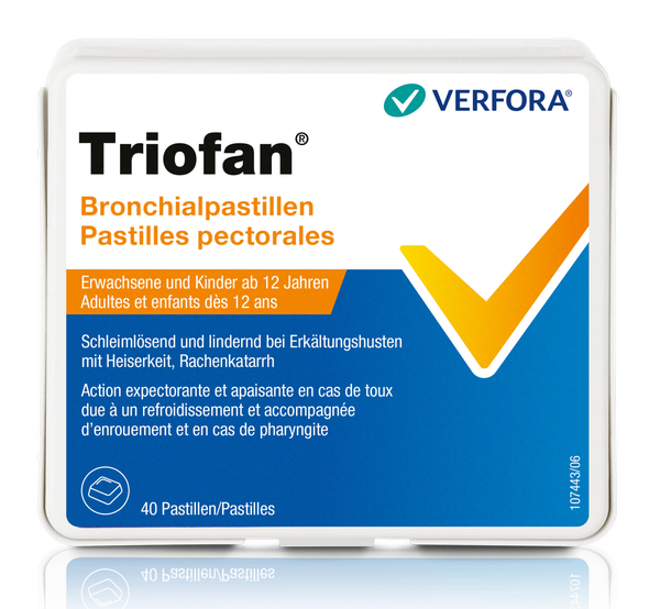 Manchmal lässt der Husten einfach nicht locker und der Schleim sitzt in den Atemwegen fest. Lösen Sie produktiven Husten doch einfach mit pflanzlicher Kraft! Triofan Bronchialpastillen lösen den Schleim. Zudem wirken die Pastillen leicht desinfizierend auf die Rachenschleimhaut. Enthalten sind unter anderem wohltuende ätherische Öle, ein Pflanzenextrakt (Senegawurzel), Menthol und Süssholzsaft, die zusammen auswurffördernd wirken