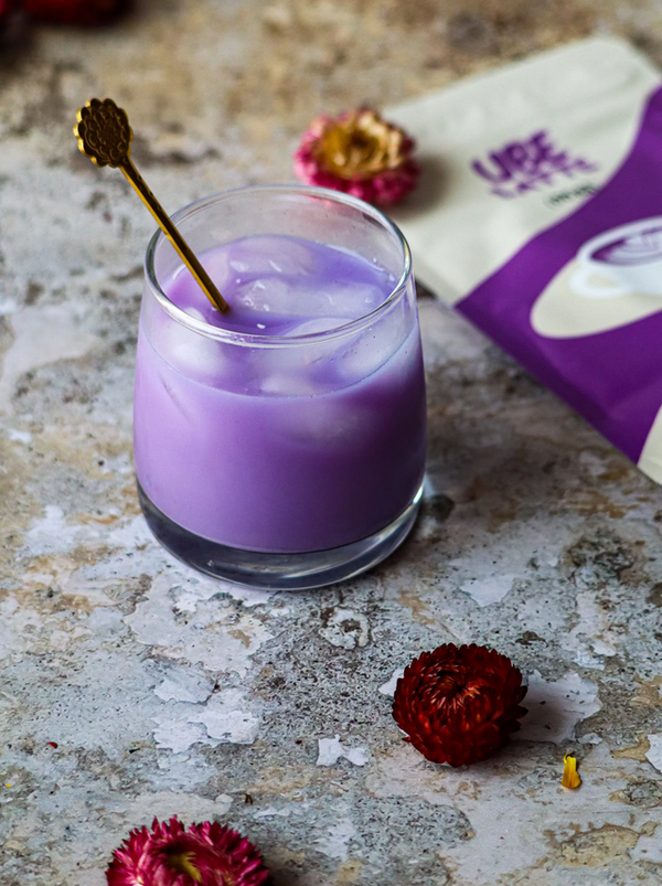 Entdecke Ube Latte Pulver 100g – ein 100% natürliches Pulver aus violetter Ube-Wurzel (Yam), ohne Zusatzstoffe, ohne Zuckerzusatz und völlig koffeinfrei.