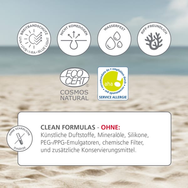 OHNE hormonell aktive Inhaltsstoffe, Octinoxate, Oxybenzone, Octocrylene, Avobenzone, Mineralöle, PEG/PPG, Aluminium, künstliche Farb- und Duftstoffe, Konservierungsstoffe.
