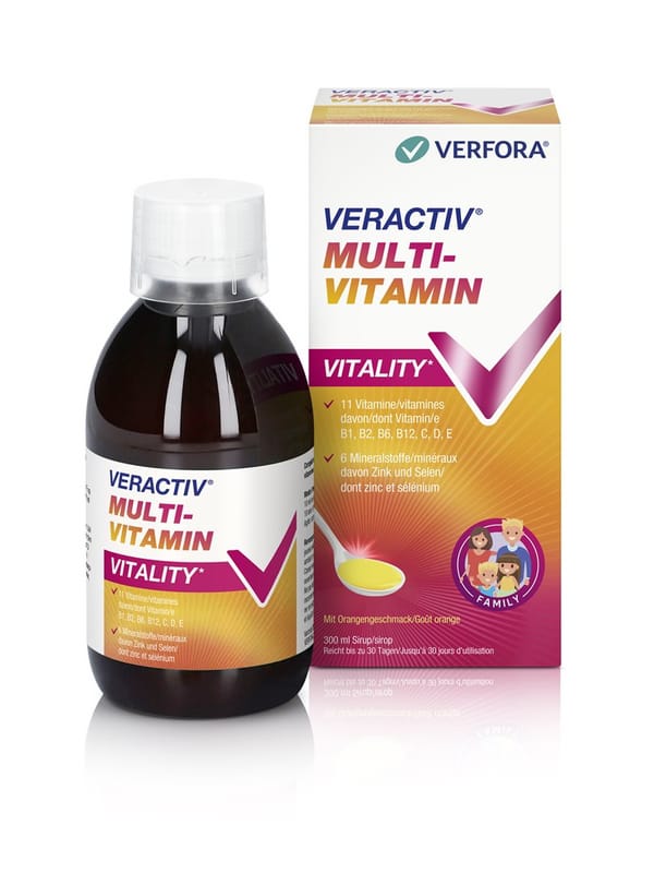Starkes Immunsystem, optimale geistige Leistungsfähigkeit und weniger Müdigkeit im Alltag: Dafür ist eine ausreichende Versorgung des Körpers mit Vitaminen und Mineralstoffen unentbehrlich. Jeder Mensch muss die kleinen „Helfer“ täglich in genügenden Mengen aufnehmen, um gesund zu bleiben und sich wohl zu fühlen. Manchmal ist der Nährstoffbedarf erhöht, zum Beispiel bei Kindern in der Wachstumsphase. Auch das Abwehrsystem braucht in den Wintermonaten mehr „Schlagkraft“. Veractiv Multi-Vitamin Sirup versorgt die ganze Familie optimal mit 11 Vitaminen und 6 Mineralstoffen – mit leckerem Orangengeschmack!