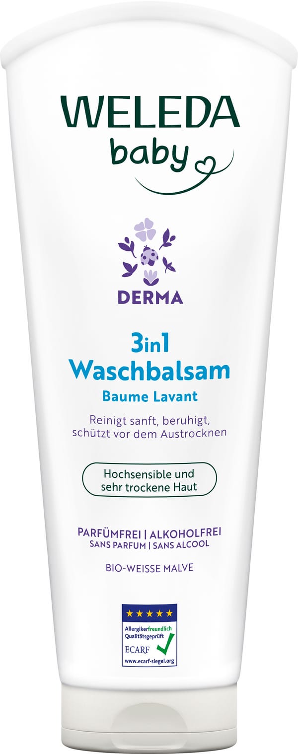 Reinige hochsensible oder sehr trockene Haut deines Babys mit dem Derma 3in1 Waschbalsam Weisse Malve von Weleda Baby! Seine seifenfreie Formel mit Weisser Bio-Malve, Bio-Nachtkerzenöl und Extrakt aus Mondo Graswurzel reinigt die Haut besonders sanft, ohne auszutrocknen. Gleichzeitig versorgt der Waschbalsam die Haut mit wertvollen Lipiden und wirkt somit rückfettend. Die Haut wird beruhigt und die Hautbarriere gestärkt.