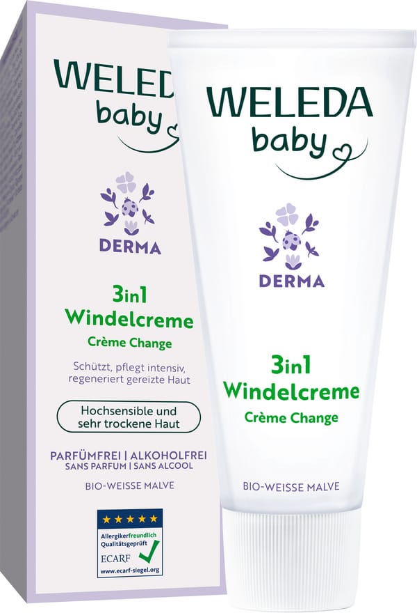 Schütze die zarte Haut deines Babys vor Irritationen im Windelbereich mit der Derma 3in1 Windelcreme Weisse Malve von Weleda Baby ! Ihre Formel mit Bio-Weisse Malve, Nachtkerzenöl und Mondo Graswurzelextrakt eignet sich ideal zur Pflege hochsensibler und sehr trockener Haut. Sie beruhigt die Haut, mindert Rötungen und Irritationen nach der ersten Anwendung. Gleichzeitig unterstützt die Windelcreme die normale Hautfunktion und die Regeneration der Haut.