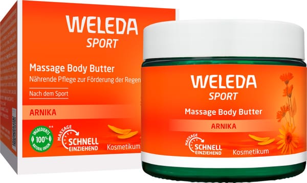 Unschlagbar nach dem Sport: Deine intensive Regeneration mit der Kraft der Arnika. Die Massage Body Butter besteht zu 100% aus natürlichen Inhaltsstoffen. Mit ihrem Feuchtigkeitsboost leistet sie intensive Pflege. Eine Massage mit der Arnika Body Butter fördert eine schnellere Regeneration. Ihre schnell einziehende Formel nährt die Haut und spendet langanhaltende Feuchtigkeit. In Kombination mit einer Massage hilft sie, Muskelkater und Verspannungen zu lindern und die Erholung - Im Vergleich zu einer klassischen Feuchtigkeitscreme - nach dem Sport zu beschleunigen.