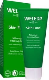 Pflegendes Sonnenblumenöl, beruhigendes Stiefmütterchen, schützende Calendula und andere intensiv pflegende Inhaltsstoffe regenerieren beanspruchte Haut, besonders an den rauen, rissigen Stellen der Hände, Füsse und Ellbogen. Skin Food Hautcreme duftet dezent nach erfrischenden ätherischen Ölen.