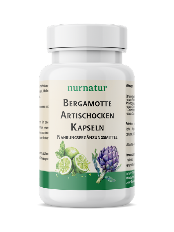Unsere Kapseln vereinen Bergamotte- und Artischocken- Extrakt mit wertvollen Flavonoiden und Cynarin. Cholin trägt zu einem normalen Fettstoffwechsel bei.