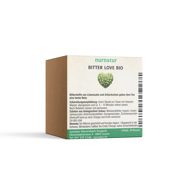 Zutaten aus biologischem Anbau: Melissenblätter, Ingwer, Löwenzahnwurzeln, Artischockenblätter, Orangenschalen, Zichorienwurzeln