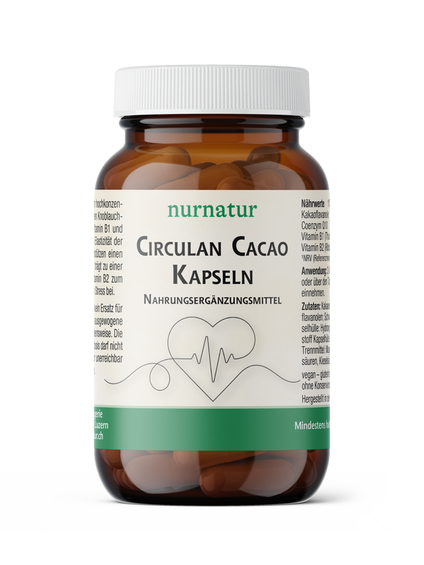 Circulan Cacao Kapseln enthalten hochkonzentrierte Kakaoflavanole, schwarzen Knoblauchextrakt, Coenzym Q10 sowie Vitamin B1 und B2. Kakaoflavanole fördern die Elastizität der Blutgefässe, was zum normalen Blutfluss beiträgt. Vitamin B1 trägt zu einer normalen Herzfunktion und Vitamin B2 zum Schutz der Zellen vor oxidativem Stress bei.