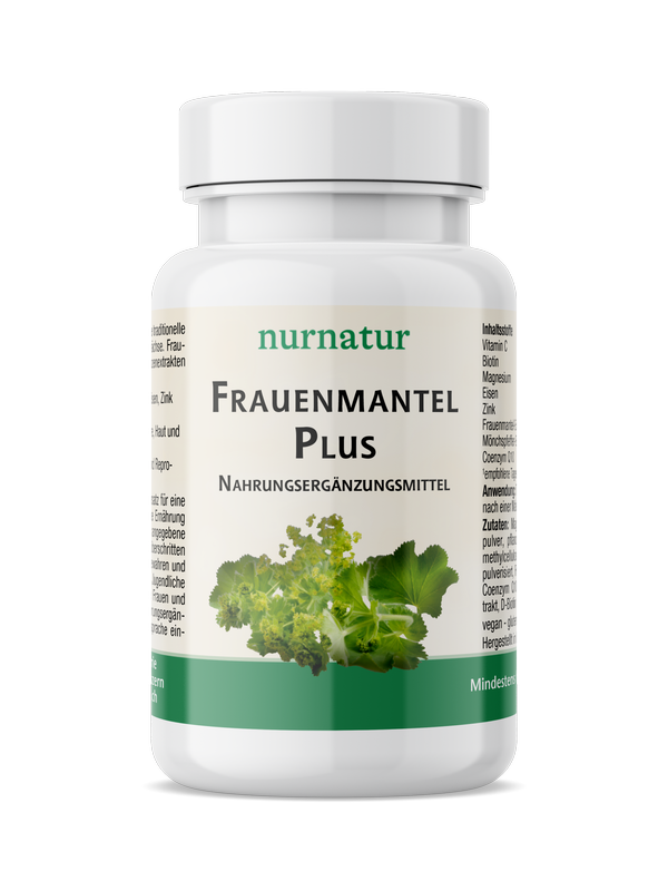 Pflanze aus der Familie der Rosengewächse. Frauenmantel Plus mit konzentrierten Pflanzenextrakten wurde speziell für die Frau entwickelt. Enthält Vitamin C, Biotin, Magnesium, Eisen, Zink und Coenzym Q10. Biotin trägt zur Erhaltung normaler Haare, Haut und Schleimhäute bei. Zink trägt zur normalen Fruchtbarkeit und Reproduktion bei.