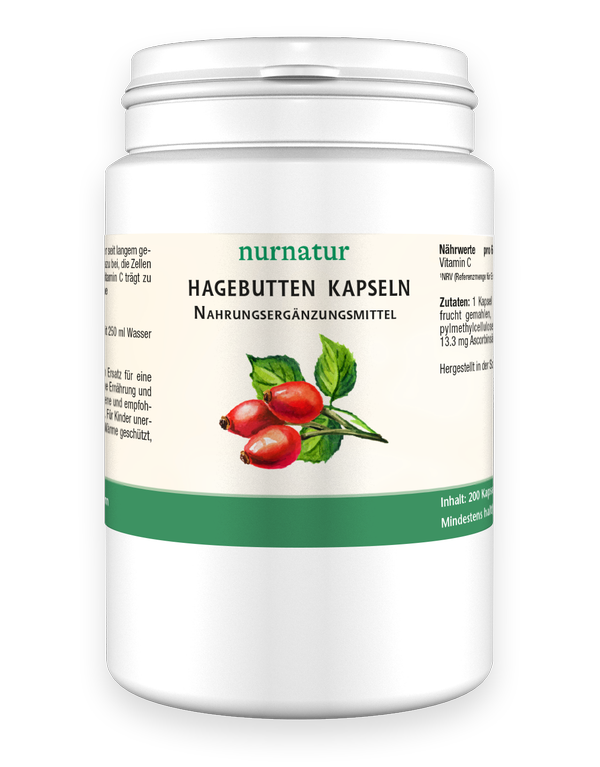 1 Kapsel enthält: 410 mg Hagebuttenfrucht gemahlen, Überzugsmittel: Hydroxypropylmethylcellulose (pflanzliche Kapselhülle), 13.3 mg Ascorbinsäure (Vitamin C).