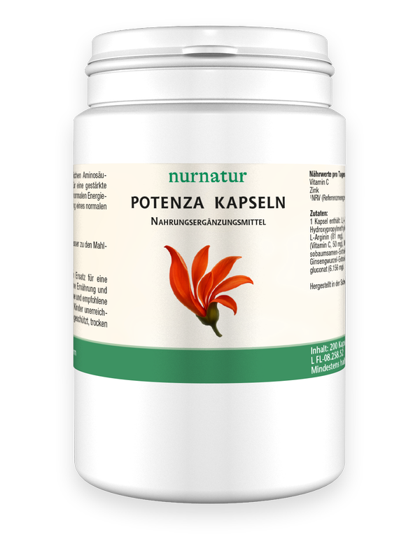 Nahrungsergänzungsmittel aus natürlichen Aminosäuren, Vitaminen und Pflanzenstoffen für eine gestärkte Manneskraft. Vitamin C trägt zu einem normalen Energiestoffwechsel bei. Zink trägt zur Erhaltung eines normalen Testosteronspiegels im Blut bei.