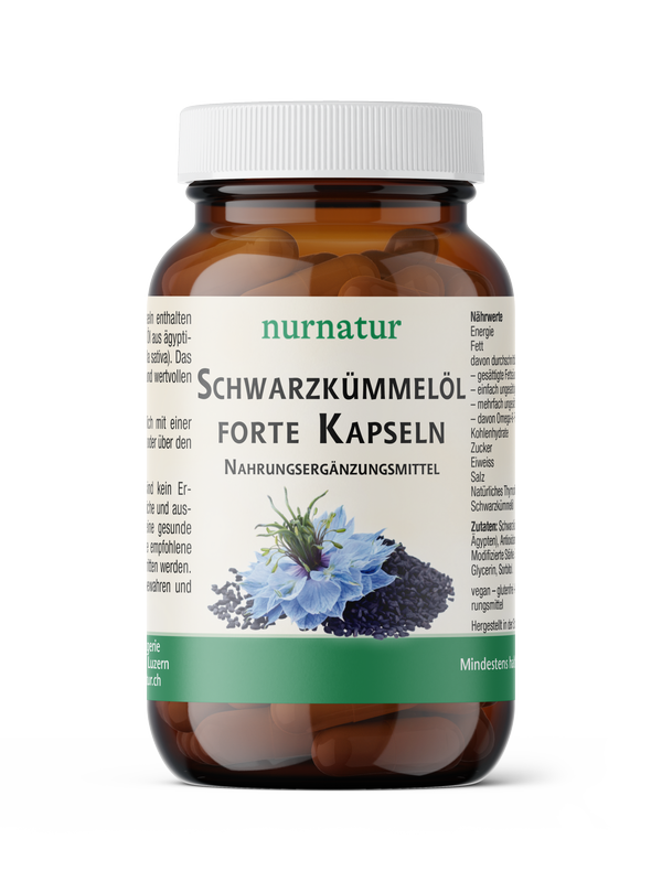 Schwarzkümmelöl forte Kapseln enthalten 500 mg schonend gepresstes Öl aus ägyptischem Schwarzkümmel (Nigella sativa). Das Öl ist reich an Thymochinon und wertvollen Fettsäuren.